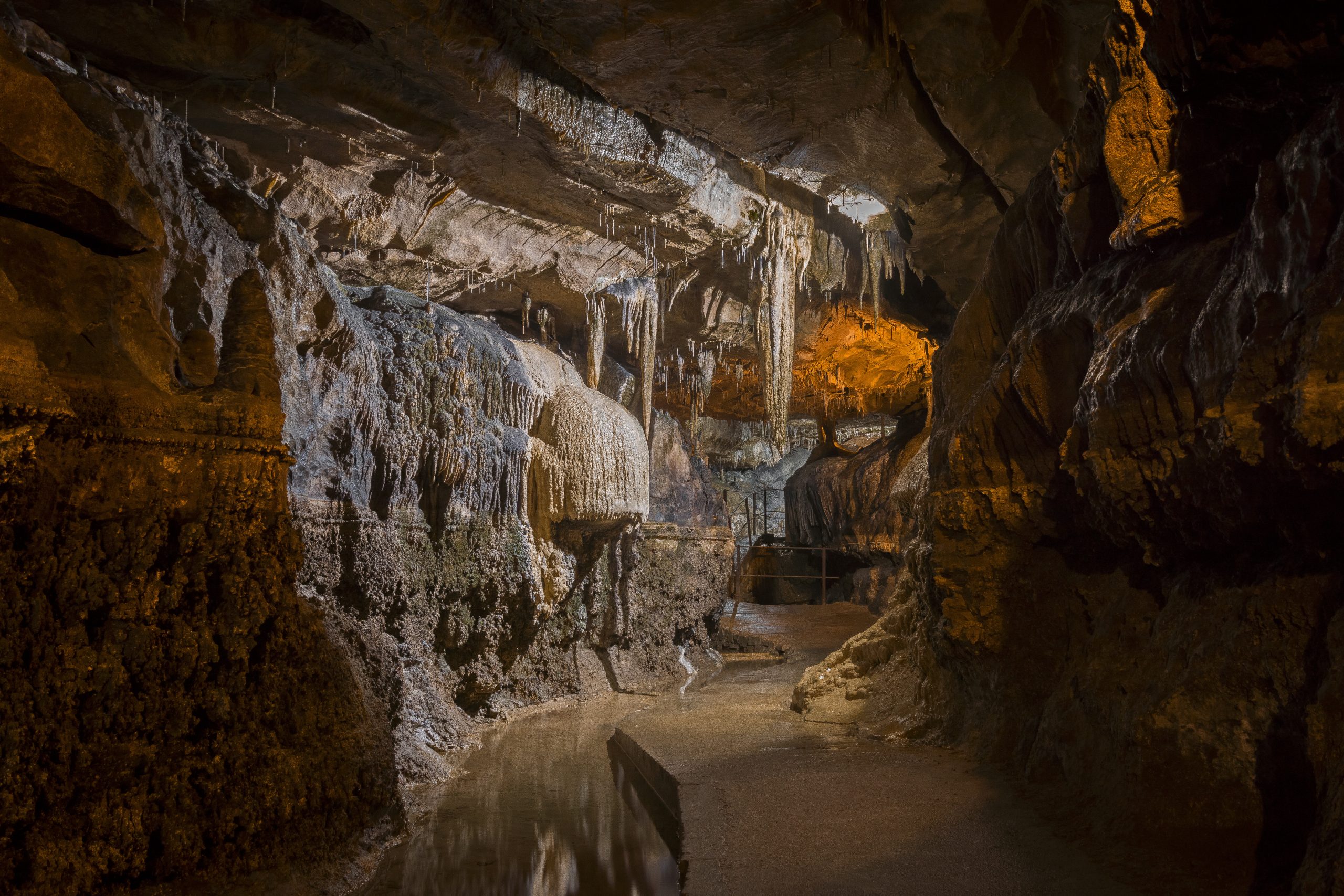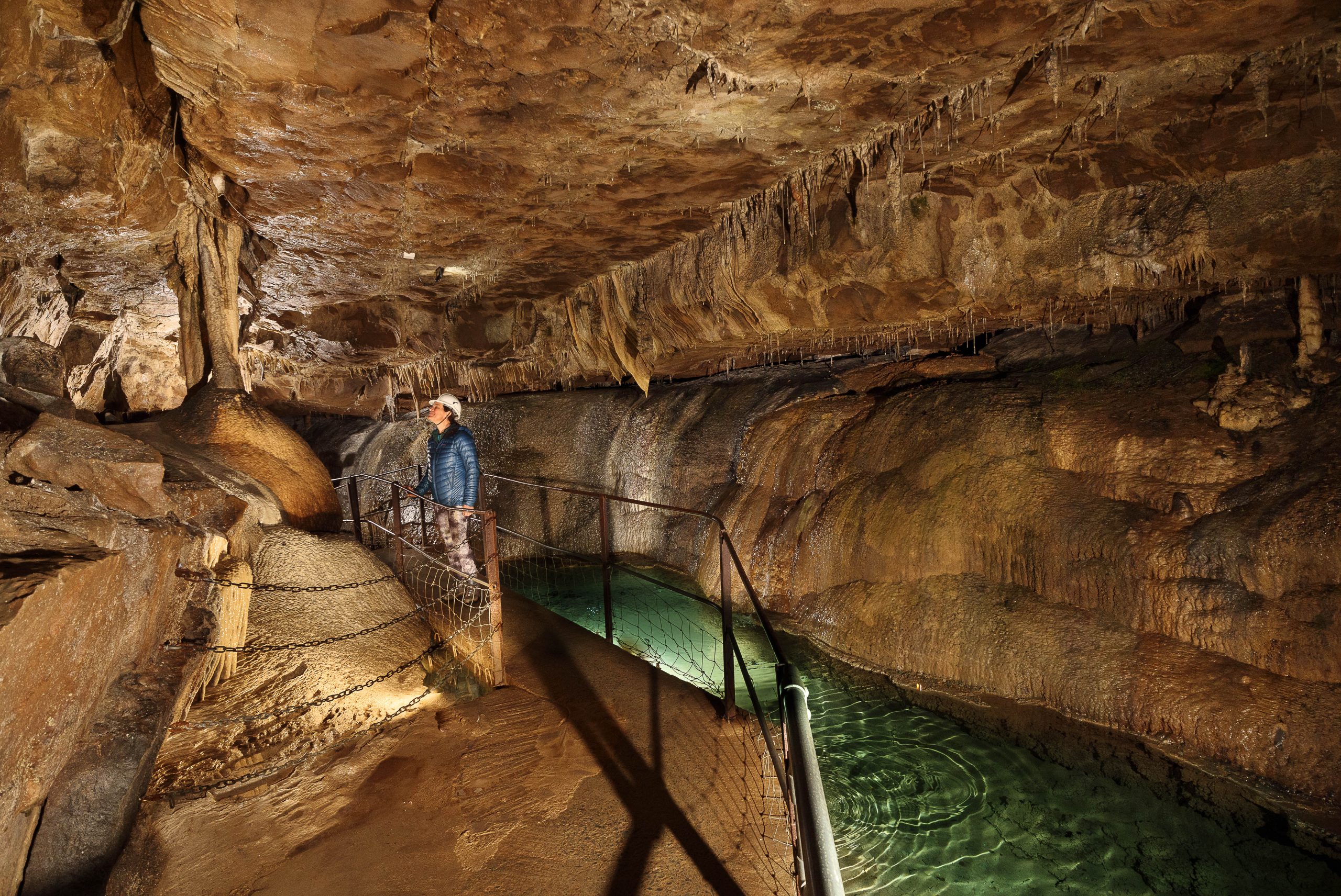 The cave is self-guided, and is a 0.3m walk underground, so 0.6m total. There are no steps, but two stooping low levels.